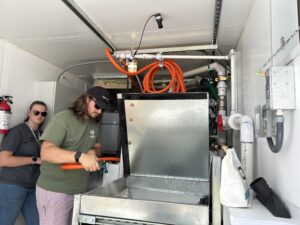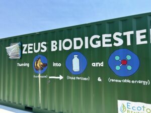 In Summer 2025, a biodigester was installed at the Rincon Transfer Station to digest and break down food scraps. This installation is part of the larger Transfer Station improvement project and was funded by an EPA grant. The biodigester can break down any food product, including meat and dairy which normal compost cannot handle, and turn it into a liquid fertilizer called “soil sauce” and methane gas. Food is put into a chute on one side of the biodigester, staff mix the food waste with water and grind it into a liquid slurry, then microbes break down the food particles, and then the soil sauce can be drained and used in gardens and landscaping.
